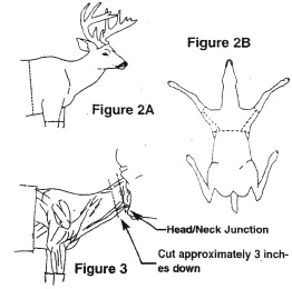 The dorsal method of skinning involves a long slit down the back(from the tail base up into the neck.) The carcass is skinned as it is pulled through this incision. The feet/hooves and the head are cut off from the carcass as with a shoulder mount explained in the next frame. Only use this method with approval and detailed instructions from your taxidermist. Use this method only when the skin can be frozen quickly after skinning.